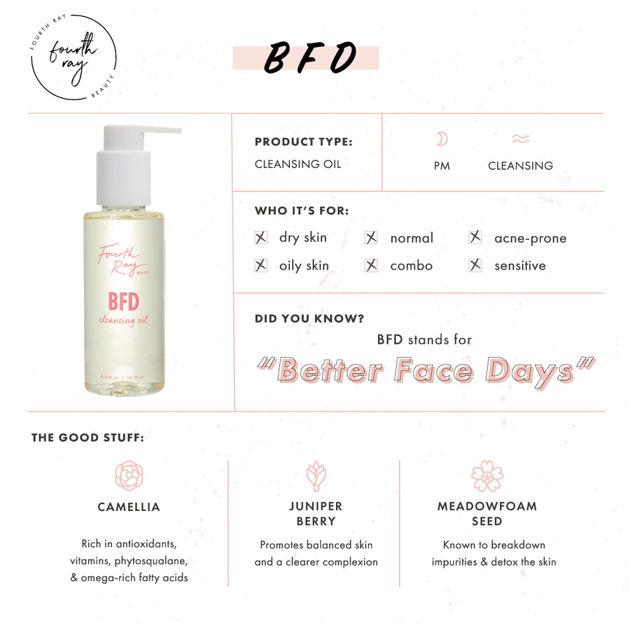 WHAT IT DOES – The first step to any skincare routine, BFD Cleansing Oil instantly dissolves and removes makeup and impurities, revealing healthy, clean skin ready for the rest of your routine.