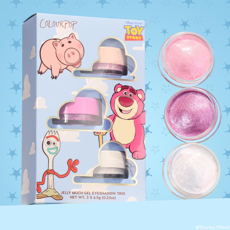 Play all day with this limited-edition trio inspired by Pixar’s Hamm, Lotso and Forky! Our innovative jelly eyeshadow delivers extremely high impact looks in a single swipe. Its unique water-based gel formula saturates the pigment for immediate intense colour right on application with minimized creasing, fading and transferring. No need to wet your makeup brush or use a primer, you’ll get the look of intense shadow right from the pot!